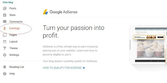 - Untuk langkah-langkahnya, pertama kalian buka terlebih dahulu blogger kalian, kemudian pilih bagian earnings.